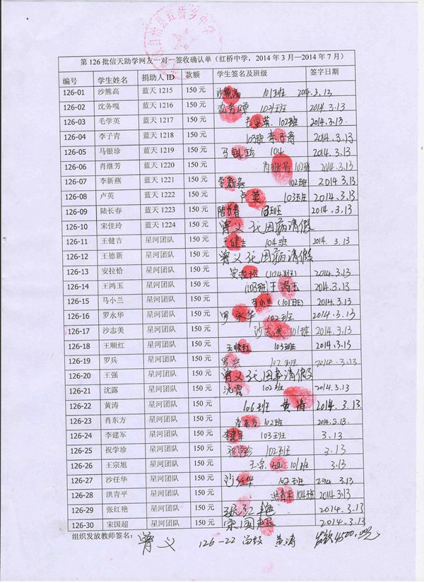 第126批红桥中学(2014年3月到2014年7月)受助学生签收单