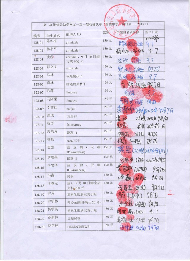蒗渠中学第128批(2013.3-2013.7)受助学生签字确认单: