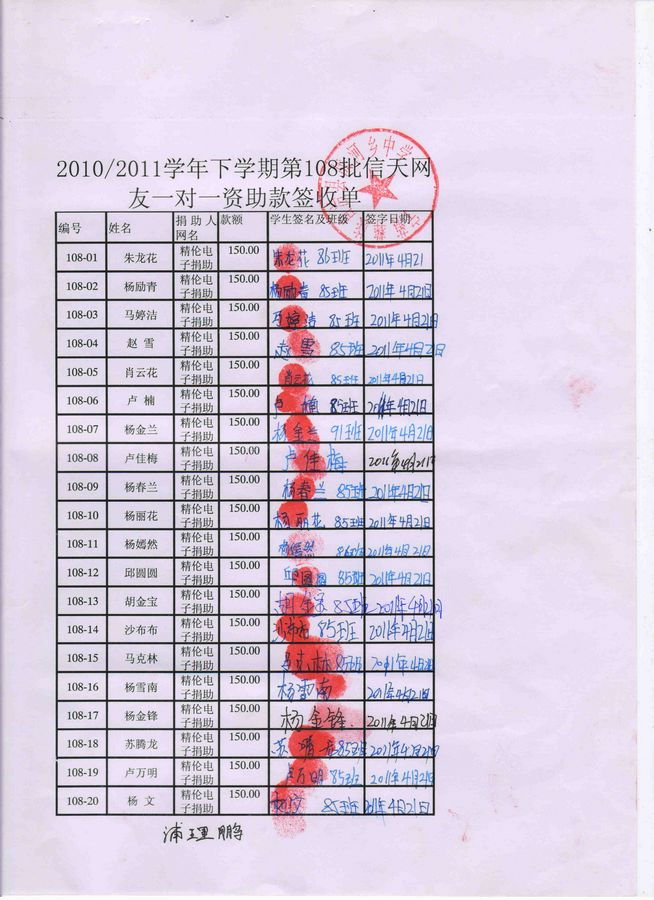 战河中学108批(2011年3月-2011年7月)信天助学款发放签名表