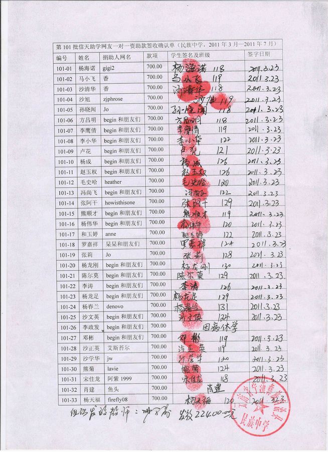 民族中学101批(2011年3月-2011年7月)信天助学款发放签名表