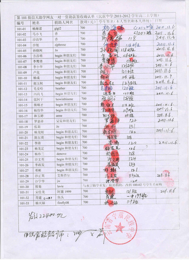 民族中学101批(2011年9月-2012年2月)信天助学款发放签名表: