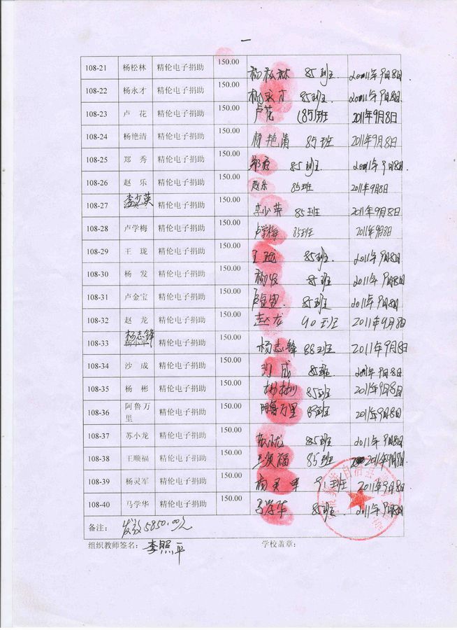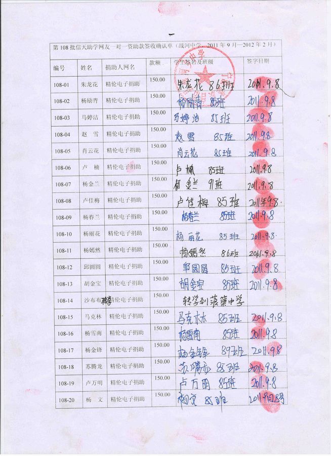 战河中学108批(2011年9月到2012年2月)受助学生签收单