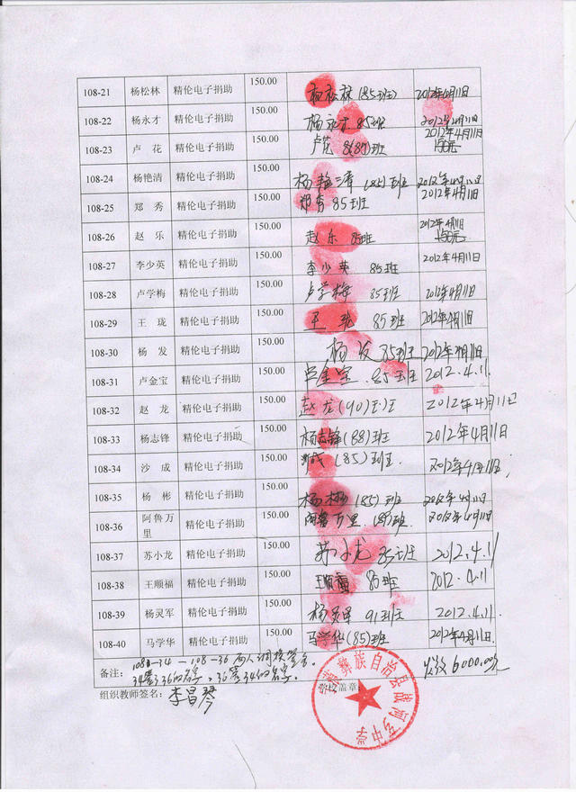 战河中学108批(2012年3月到2012年7月)受助学生签收单
