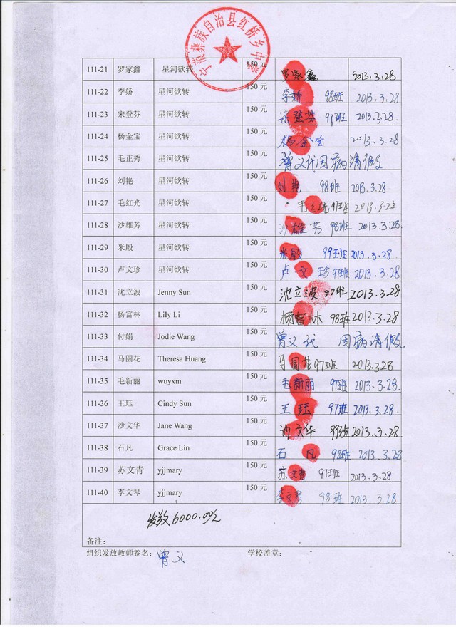 红桥中学111批(2013年3月到2013年7月)受助学生签收单