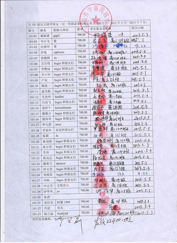 民族中学101批(2013年3月-2013年7月)信天助学款发放签名表