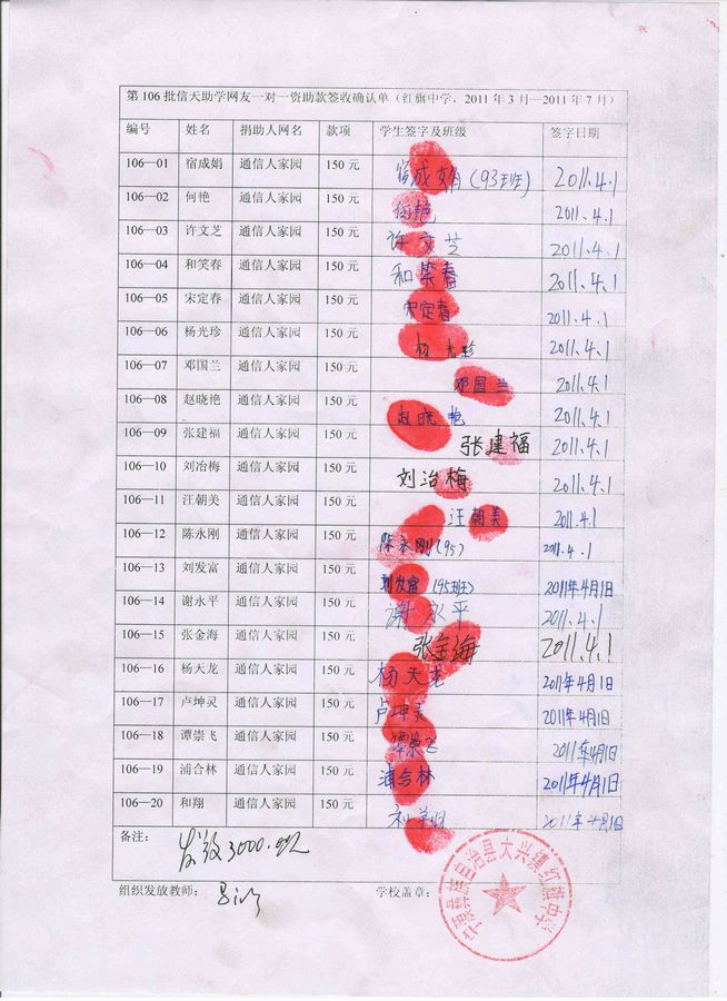 红旗中学106批(2011年3月-2011年7月)信天助学款发放签名表