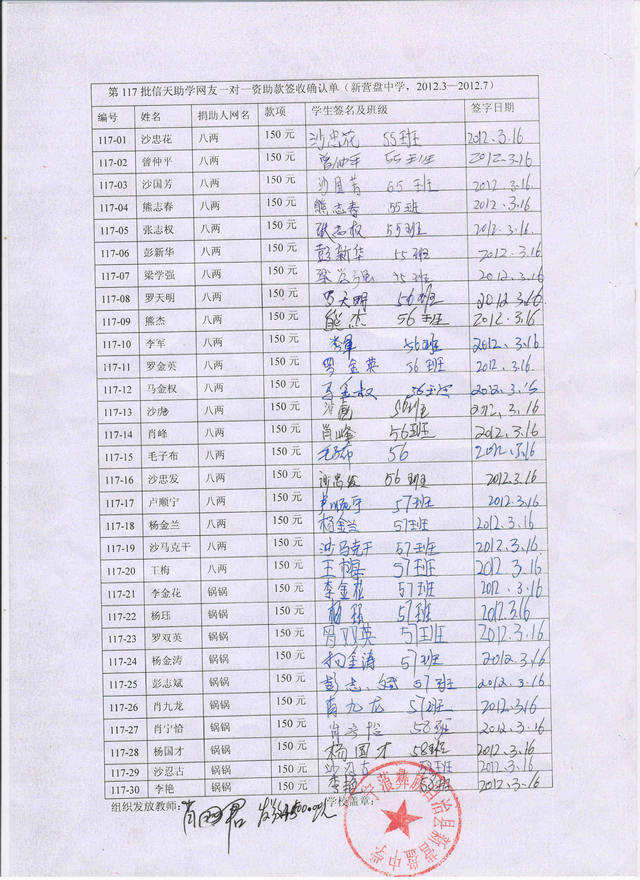 新营盘中学117批(2012年3月-2012年7月)受助学生签收单