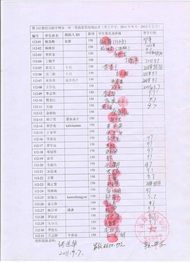 翠玉中学112批(2011年7月-2012年2月)受助学生签收确认单