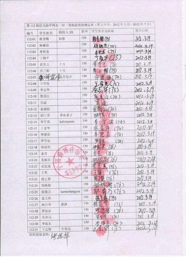 翠玉中学112批(2012年3月-2012年7月)受助学生签收确认单