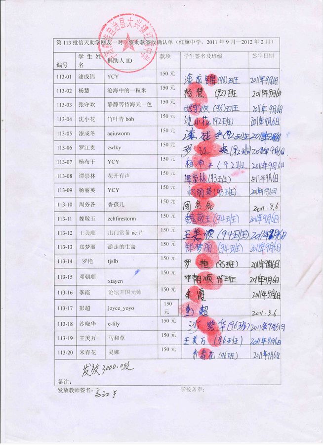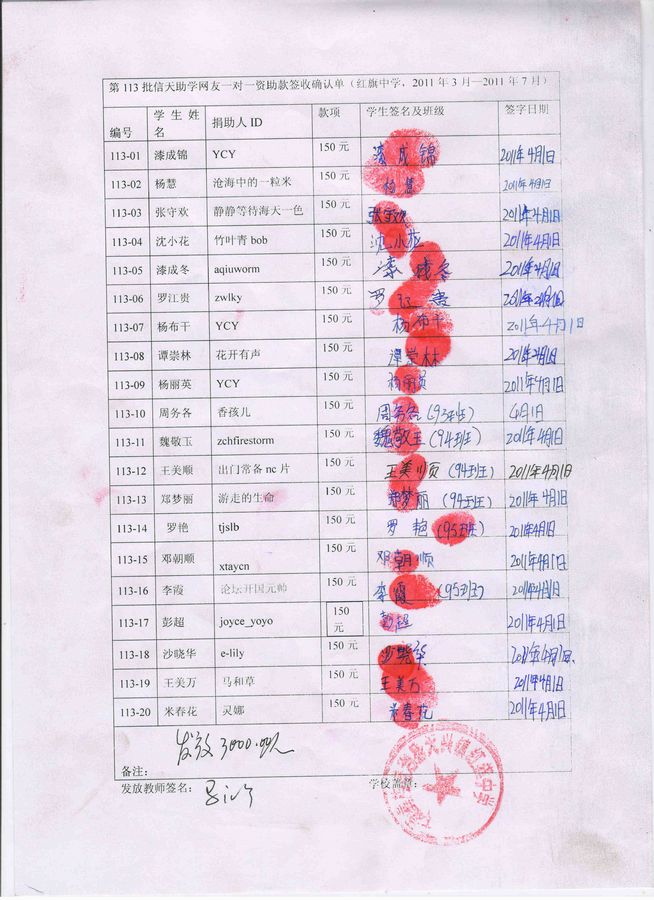 红旗中学113批(2011年3月-2011年7月)信天助学款发放签名表
