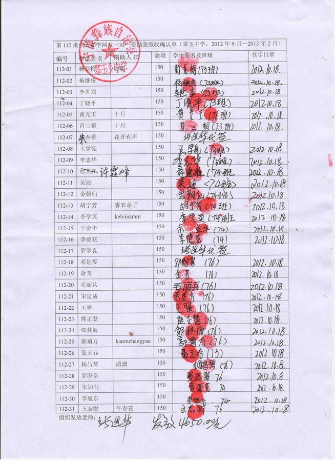» 第112批受助生名单(翠玉中学初一31名学生,完毕)