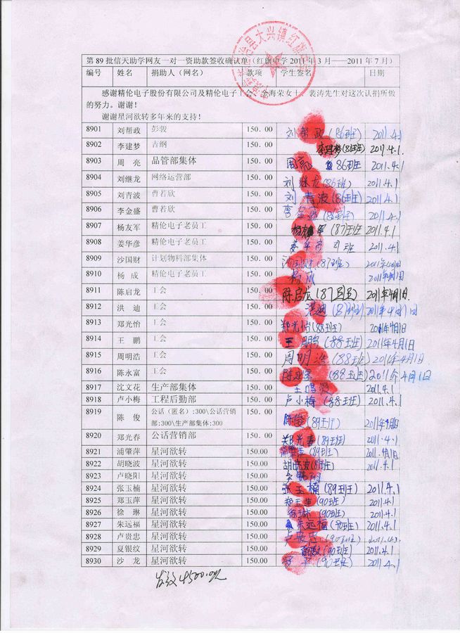 红旗乡中学89批(2011年3月-2011年7月)信天助学款发放签名表