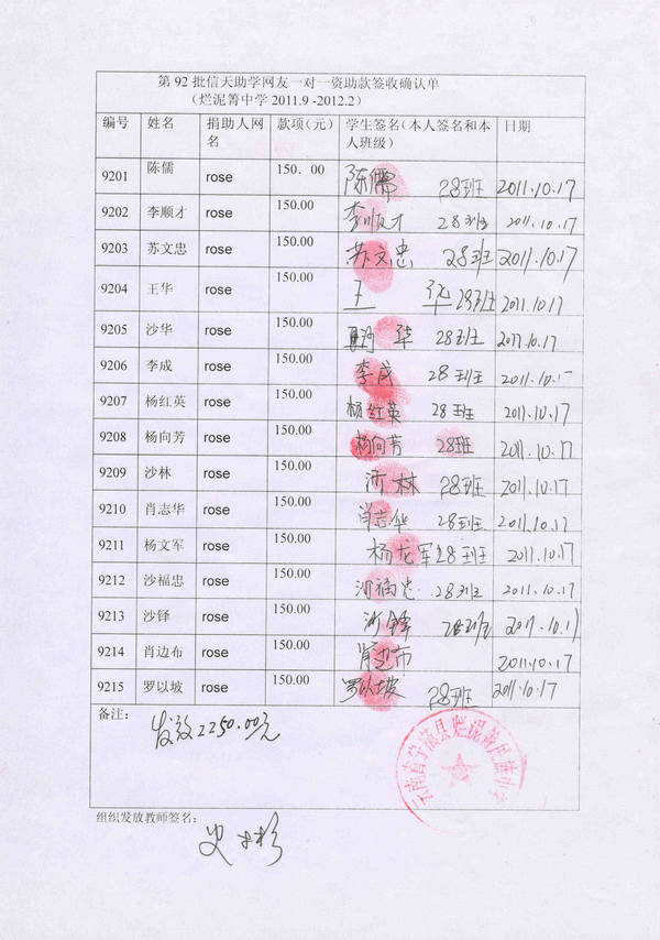 烂泥箐中学第92批(2011年3月-2011年7月)信天助学款发放签名表