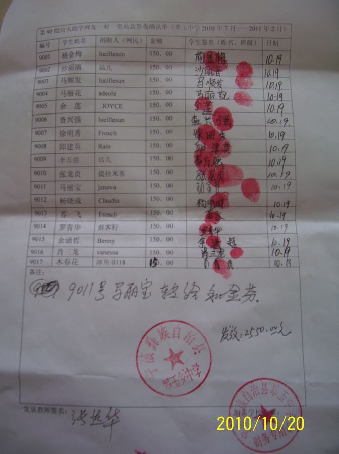 翠玉中学90批(2010年7月-2011年2月)受助学生签收确认单