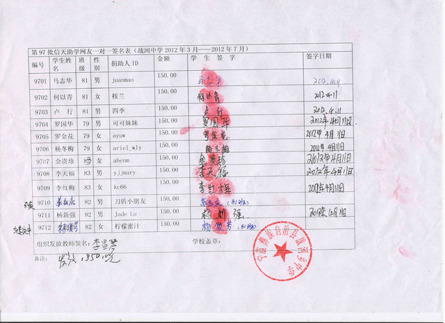 战河中学97批(2012年3月到2012年7月)受助学生签收单