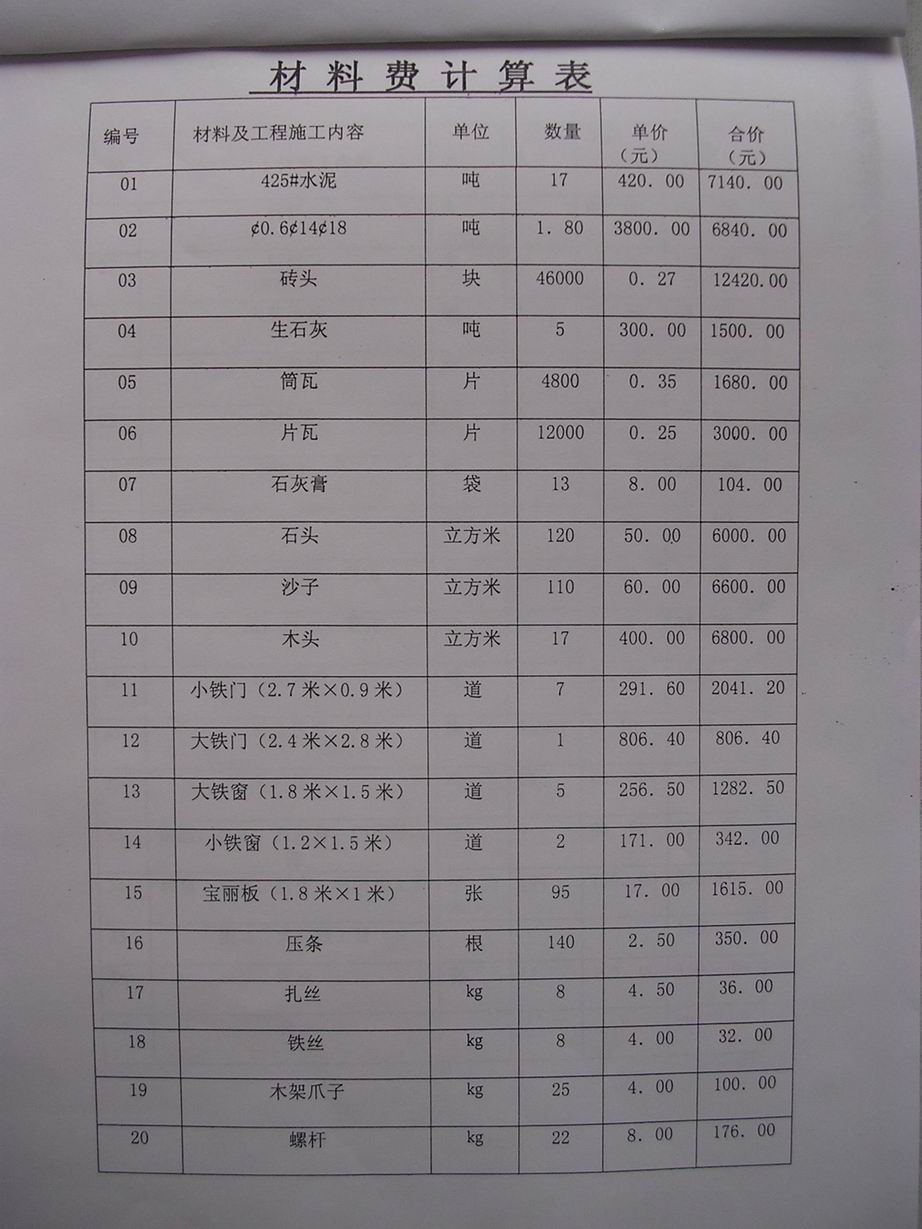 1.     水泥(425#)   吨   17   420.00   7140.00