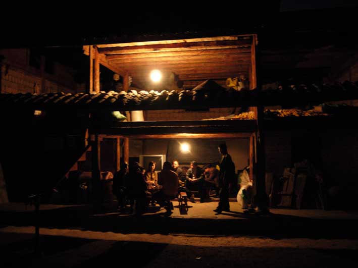 天渐渐地黑了,小楼里扯来一盏白炽灯,发出昏黄的光。周围安静极了,只有狗在有一声没一声的乱叫着。但这种山野的宁谧很快就被打破了,为了我们的到来,虎村长以及村子里的很多人为我们准备了他们的特色夜宴。