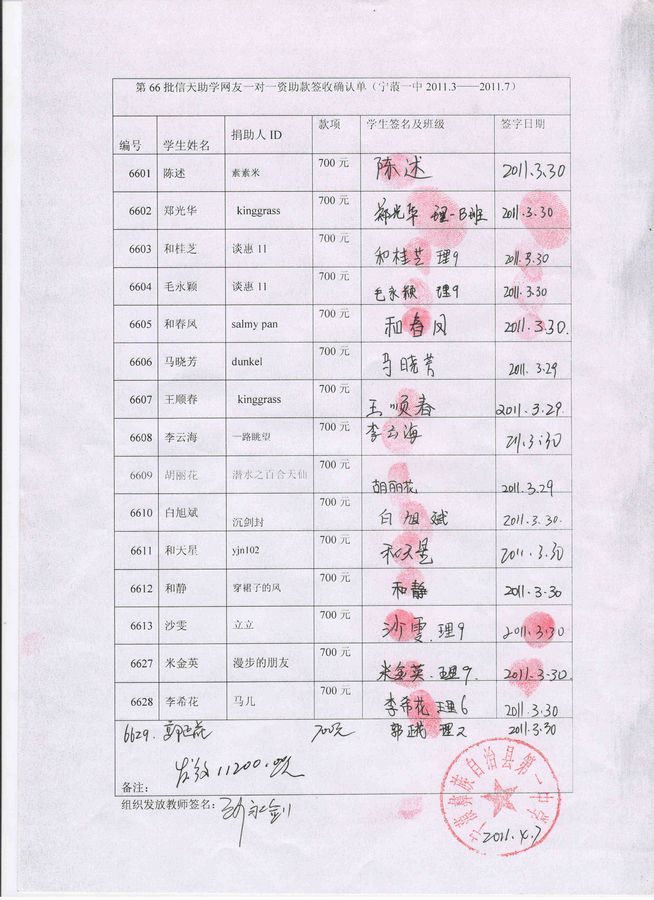 宁蒗一中66批(2010.9-2011.2)受助学生签字确认单
