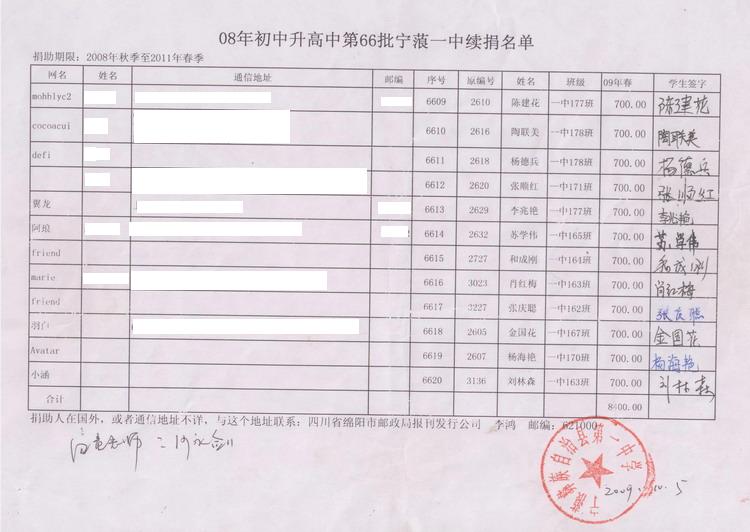 编号 受助生姓名 初中时期编号 资助人 2010年款项汇入时间 汇入金额