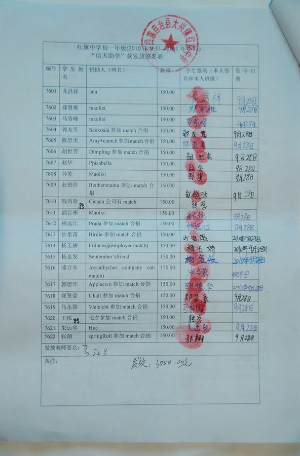 红旗乡中学76批(2010年9月-2011年2月)信天助学款发放签名表