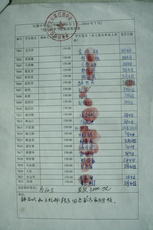 红旗乡中学76批(2010年3月-2010年7月)信天助学款发放签名表