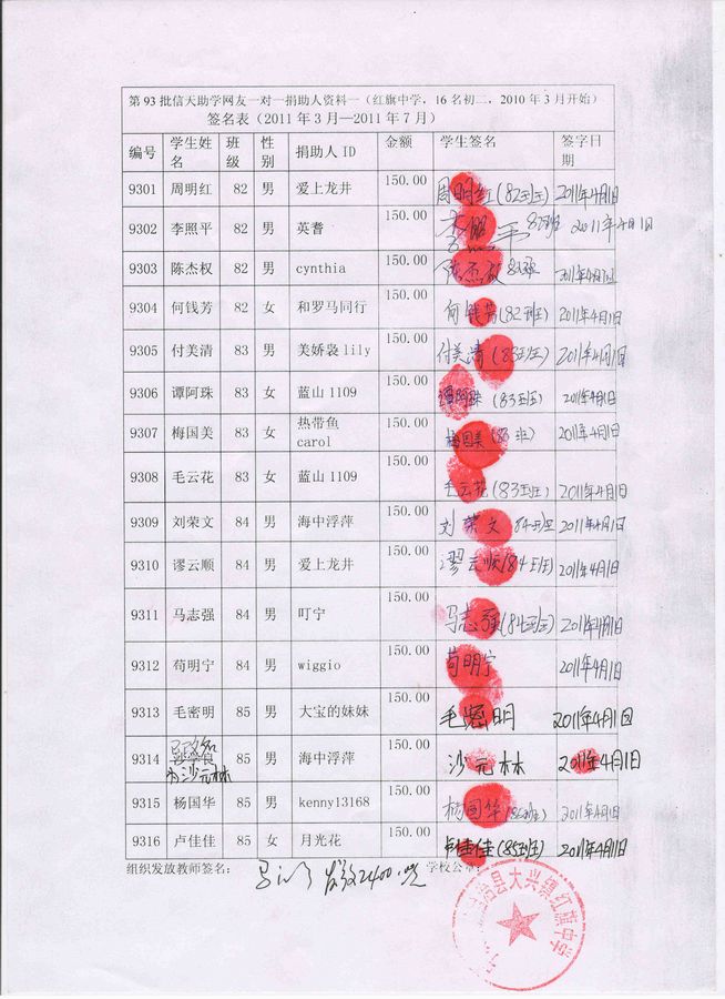 红旗乡中学93批(2011年3月-2011年7月)信天助学款发放签名表