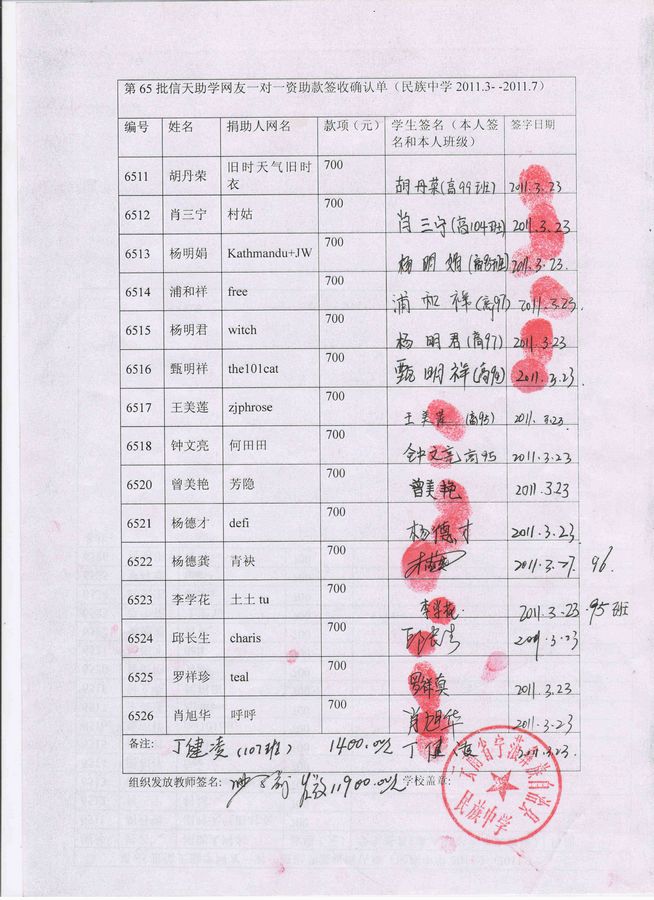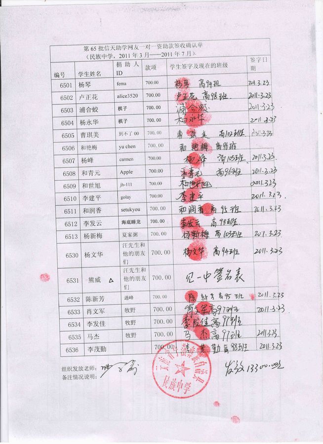 备注:签收单上丁健凌同学原编号为6818,在宁蒗一中就读,2010年9月-2011年2月上学期资助款发放时,这名学生已经辍学因此未签收资助款,之后这名学生又到民中就读,故本次签收在65批签收单上,发放一年资助款1400元。