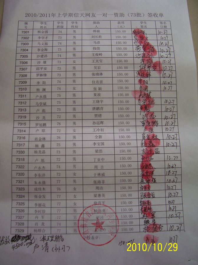 战河中学73批(2011年3月-2011年7月)信天助学款发放签名表