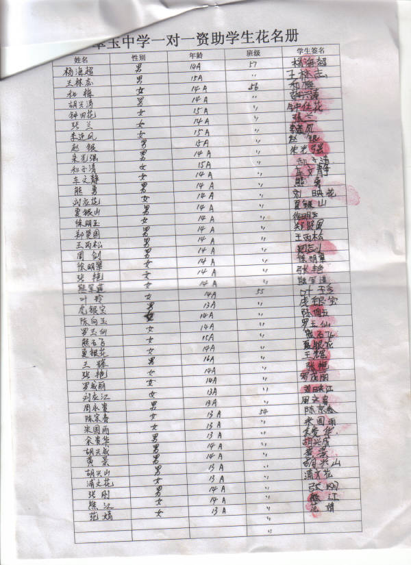 2005年5月20日我和王贵才老师受信天谨游的委托,前往翠玉中学,作家庭贫困、成绩优良的学生调查。