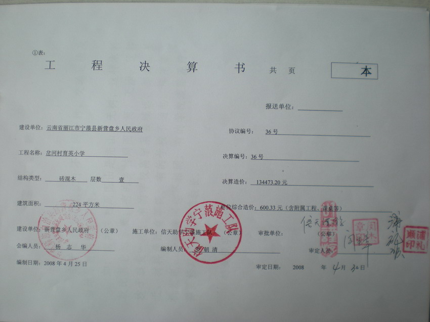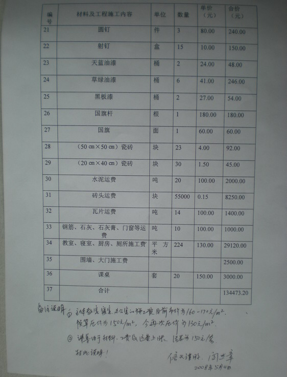 2、现在当地建筑材料比较紧张,砖头被阿海水电站提前购买,买砖困难。柴油也要排队2公里,并限量加油,运费增加。施工费也在涨价,原来为130元/平米,现在市价为160-170元/平米,我们预算压价为150元/平米,课桌原来是100元/套,现在为120元/套。