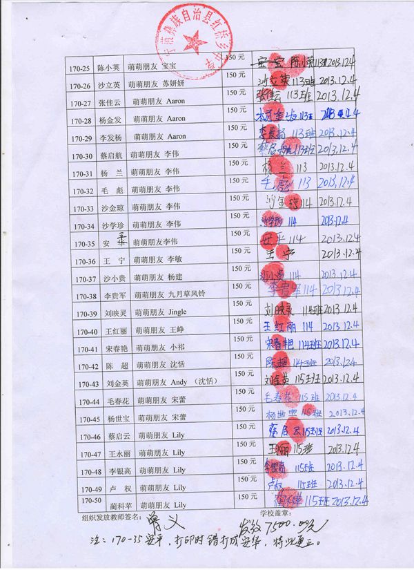 第170批红桥中学(2013年9月-2014年2月)受助生签收单