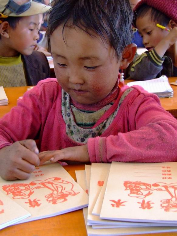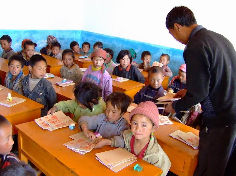 了解到现共有学生44位,1~2年级有25人,学龄前有19人,现有课程有语文、数学、美术和音乐。美术课教一些简单的图案,而音乐课只是教唱一些儿歌。由于孩子们的汉语基础很差,我无法和他们用汉语交流,都是通过老师翻译才能交流,二年级的学生也只是看到拼音才能读出一些简单的文字。我想这与师资的缺乏很有关系。