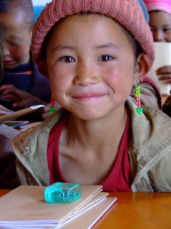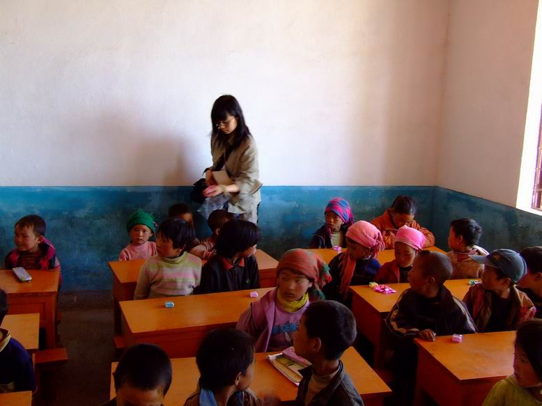 一段震得人快散架的山路之后,而在没有任何心理准备的时候,车停在了村小门口,一群可爱的孩子出现在我们面前,此次的我已无法控制自己的眼泪,因为孩子们比我想像中的更瘦更黑。孩子们看到我们的到来无比的高兴,纷纷排好队进入教室。我也调整了自己的情绪,进入教室之后,看到狭小的空间里放满了课桌椅(由于只有一位老师,所以所有的学生都在一起上课),只有老师可走动的空间,更谈不上是否有讲台。接下来我和老师为孩子们分发文具、课外读物和糖果,此时孩子们都露出了欢喜的笑容,把文具排排放,我的心中也感到了一丝欣慰,也许这是带给孩子们最好的礼物了。当老师给二年级的学生戴红领巾时,他们都显得无比的兴奋和高兴,本来灰灰的教室里,有了红领巾之后变得明亮起来。在给孩子们拍照的过程中,发现由于缺水的原因,孩子们的脸上和手上都是黑黑的一层污垢,衣服都是灰灰的,满屋子的苍蝇叮在他们的身上。