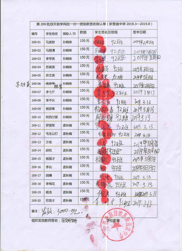 第269批新营盘中学(2019年3月到2019年8月)受助学生签收单