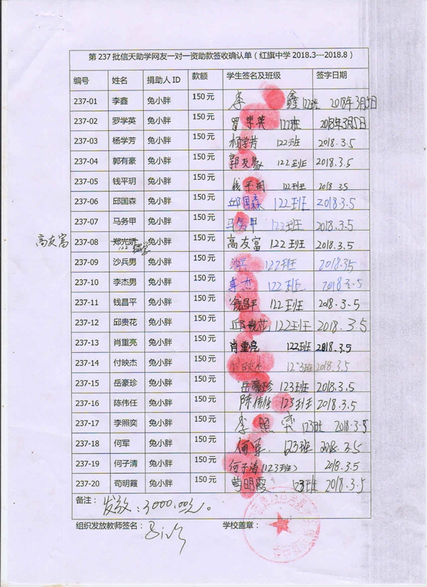第237批红旗中学(2018年3月-2018年8月)受助学生签收确认单