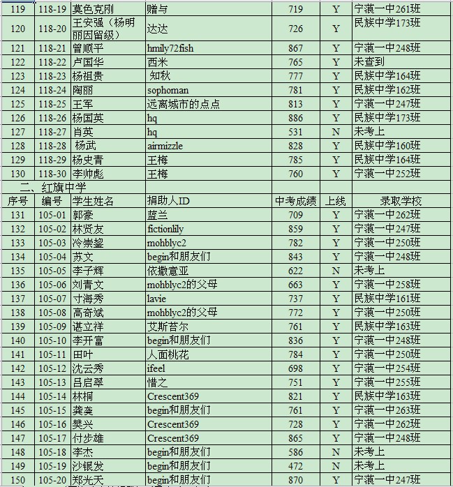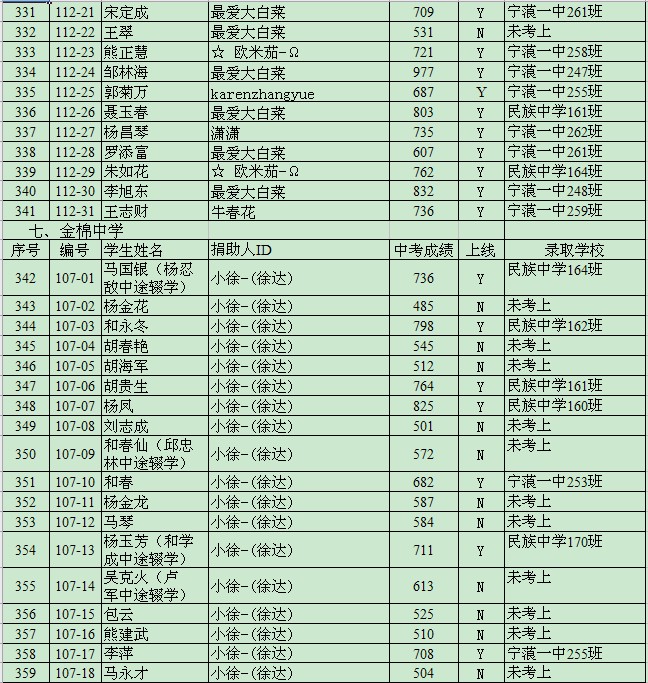 新编号------ 原编号-------学生姓名--------捐助人ID---------中考成绩--------录取学校