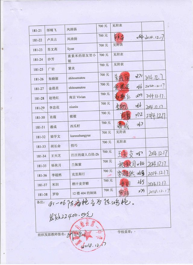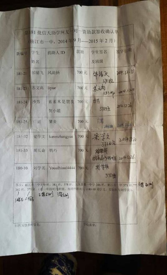 注:在签收单上,见附表的,几名学生是就读于丽江市一中,负责的老师正在发款了,相关的签收单随后补充。