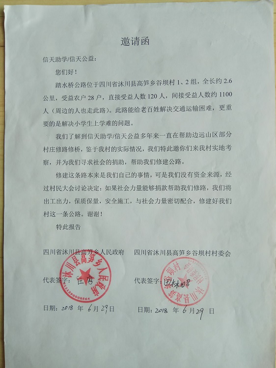 踏水桥公路位于四川省沐川县高笋乡谷坝村1、2组,全长约2.6公里,起点:核桃树,终点:踏水桥,受益农户28户,直接受益人数120人,间接受益人数约1100人(周边的人也走此路)。此路能给老百姓解决交通运输困难,更重要的是解决小学生上学难的问题。村民修路决心很大,全力集资,350元/户,共集资9800元,计划修通土路、支路、涵管、并铺设部份路面块石,力争雨季也能通车。