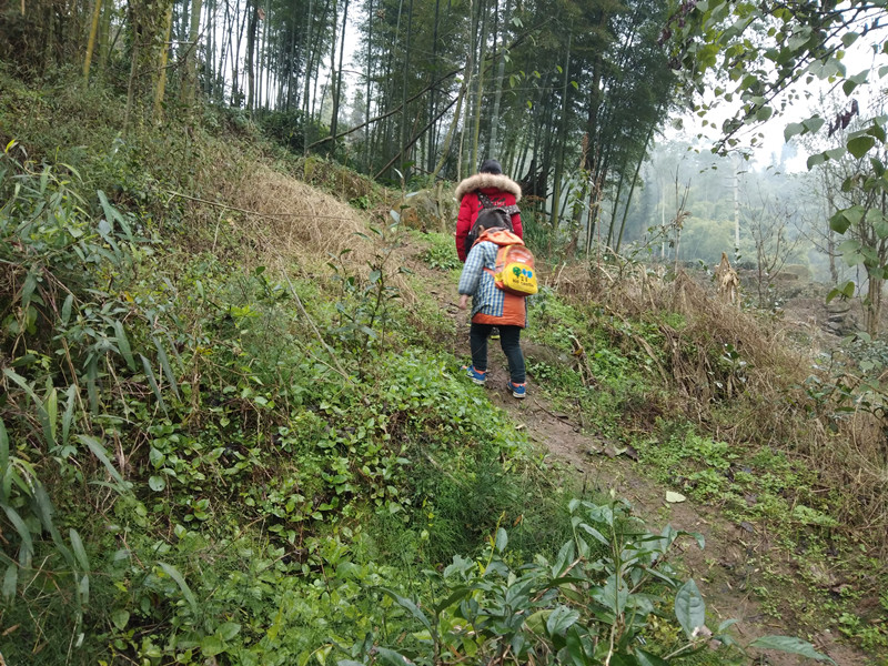 小学生上学之路,等修好了路之后,就可以坐三轮车、面包车上学了,或者骑自行车上学了。