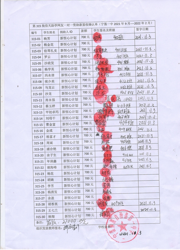 第315批宁蒗一中(2021年9月-2022年2月)受助学生签收单