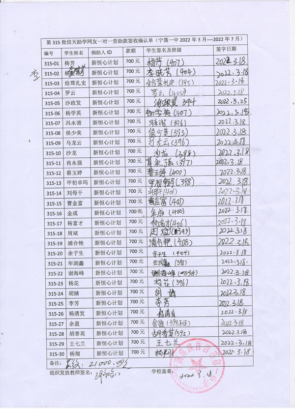 第315批宁蒗一中(2022年3月-2022年7月)受助学生签收单