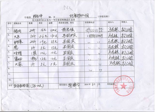 abbr_贯制学校,阿鲁村幼儿园2014年六一节日宴采购物品汇总表.jpg