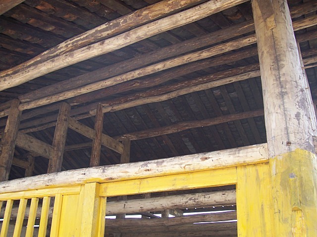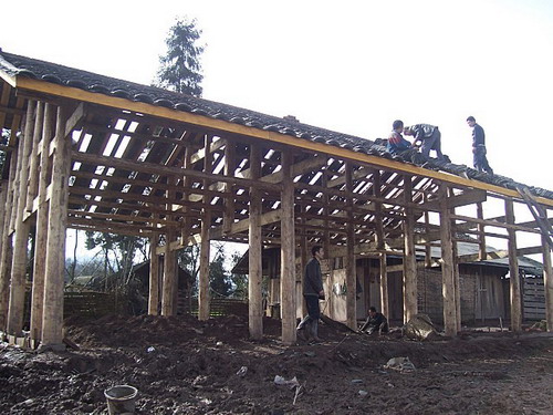 : [这个村校建设采用结构的是木架砖墙瓦房。现在木架已经搭起,正在上瓦。]