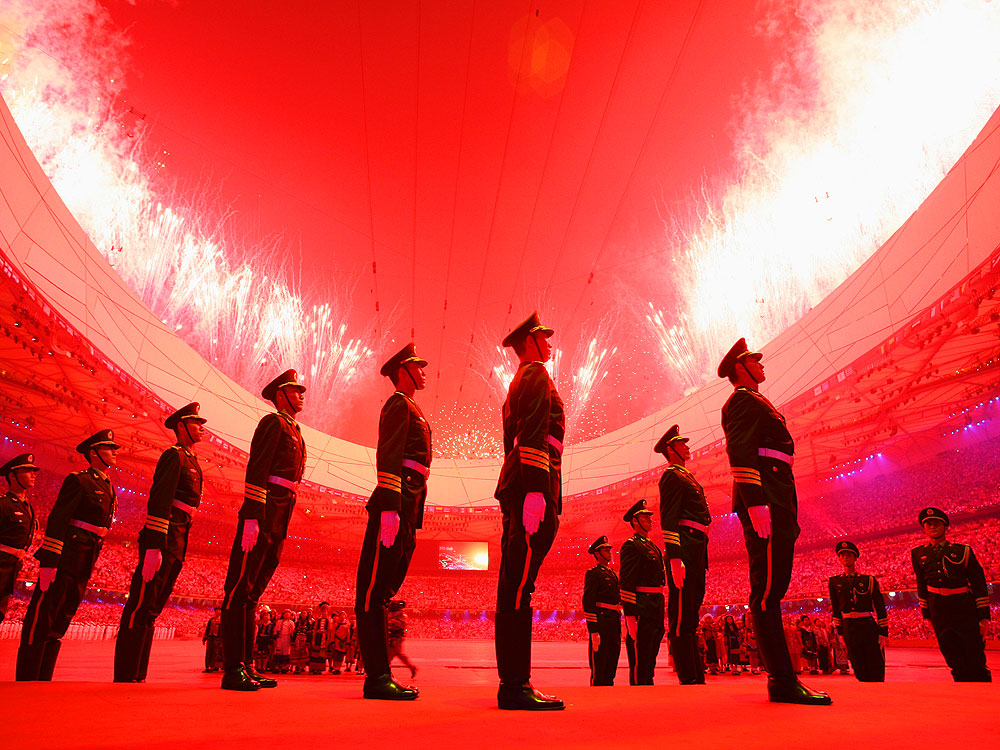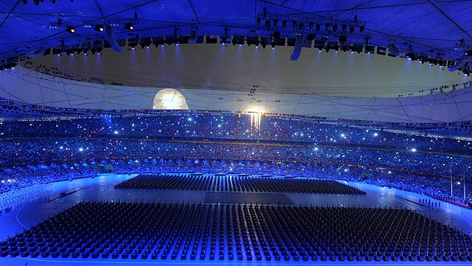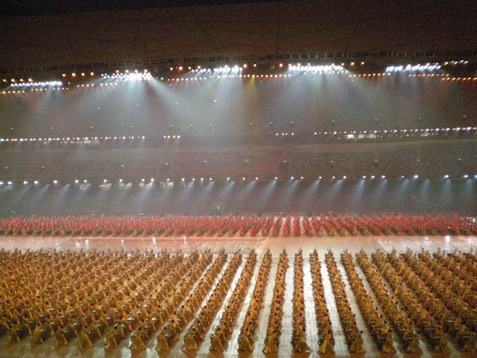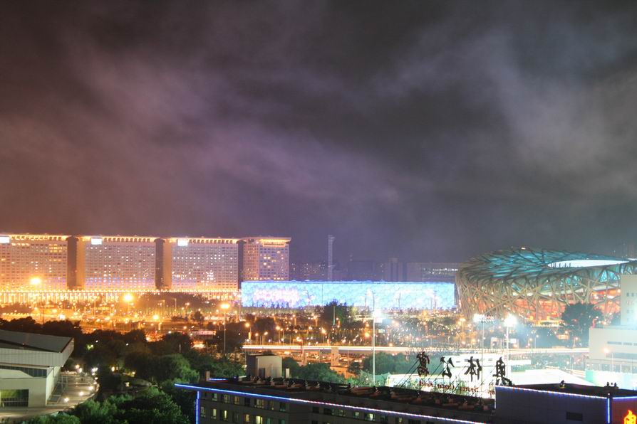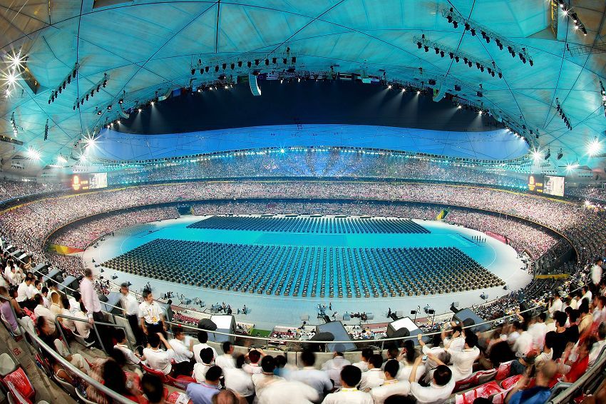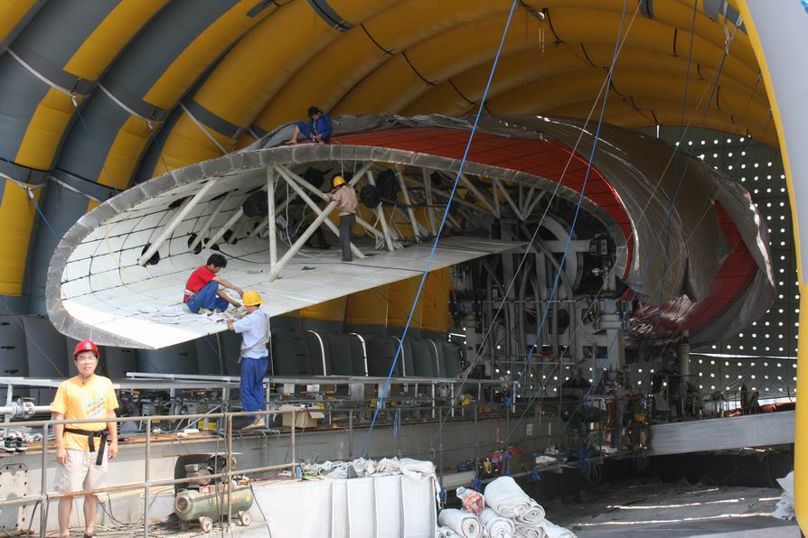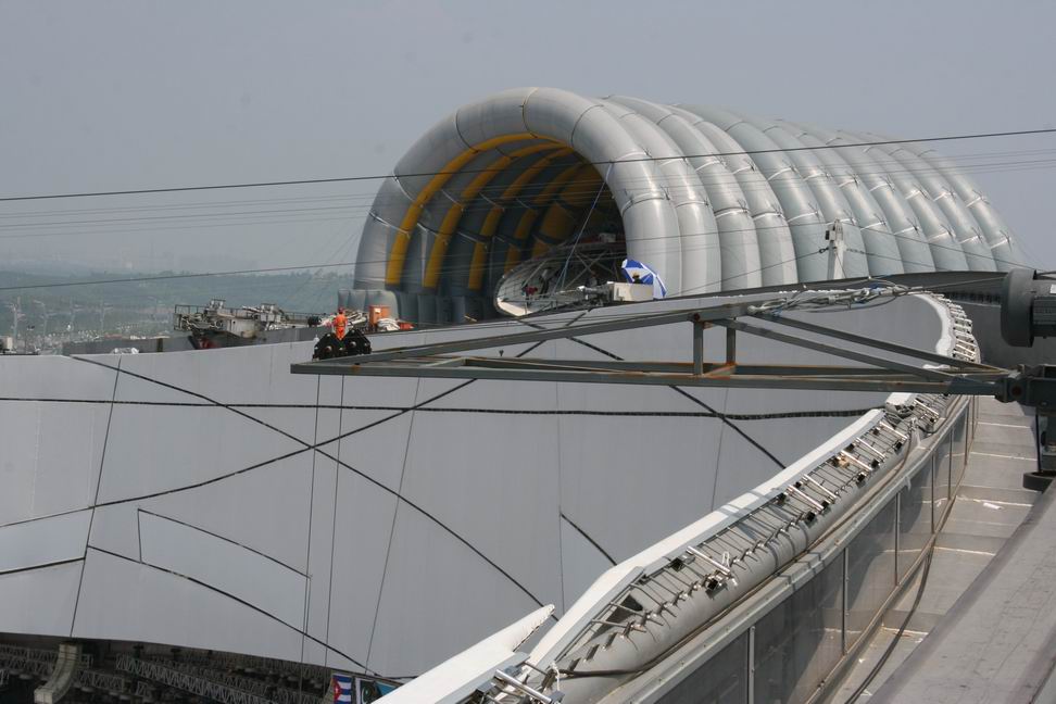 吊李宁的屋顶铁架子...沿着鸟巢顶部的轨道滑行一周.