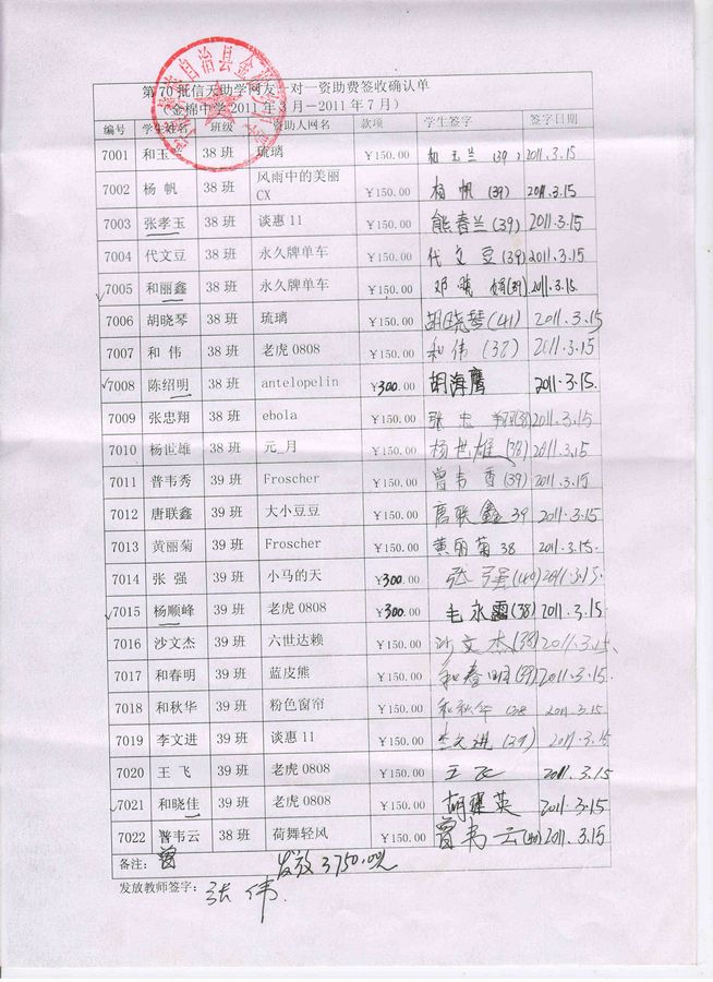 备注:(1)签收单上7003、7005、7008、7015、7021这5名学生已替换为其他学生,其中7008和7015号学生签收300元(原捐助学生上学期未签收,故此次替换学生签收300元)。