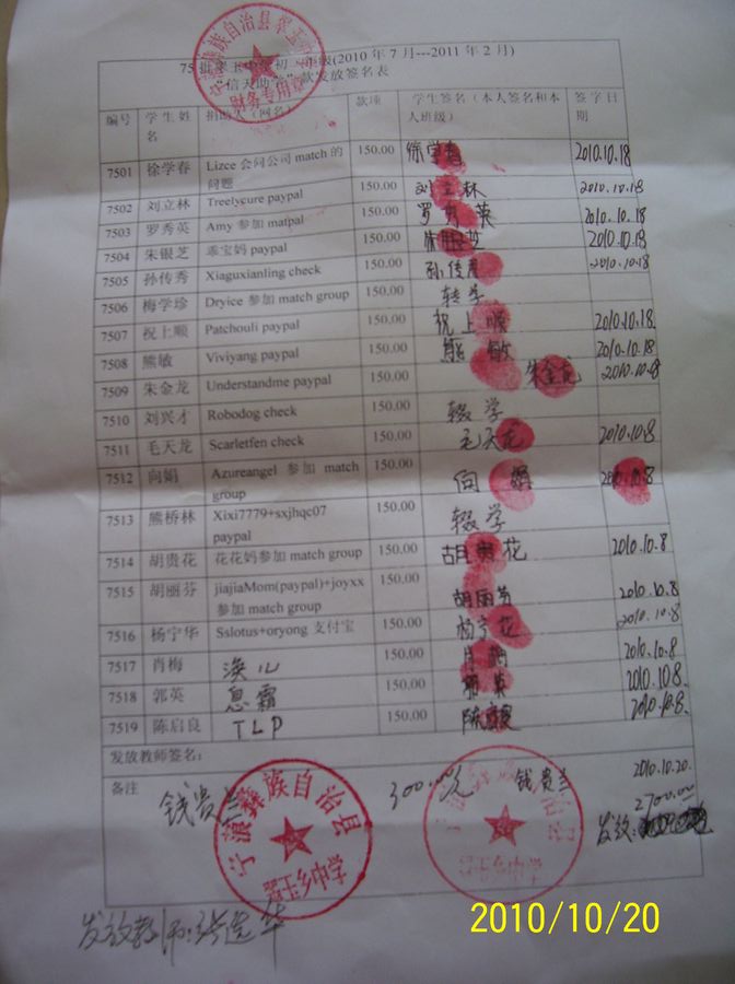 翠玉中学75批(2010年7月-2011年2月)受助学生签收确认单