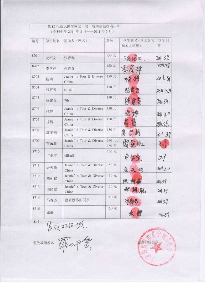 宁利中学87批(2011年3月-2011年7月)受助学生签收确认单