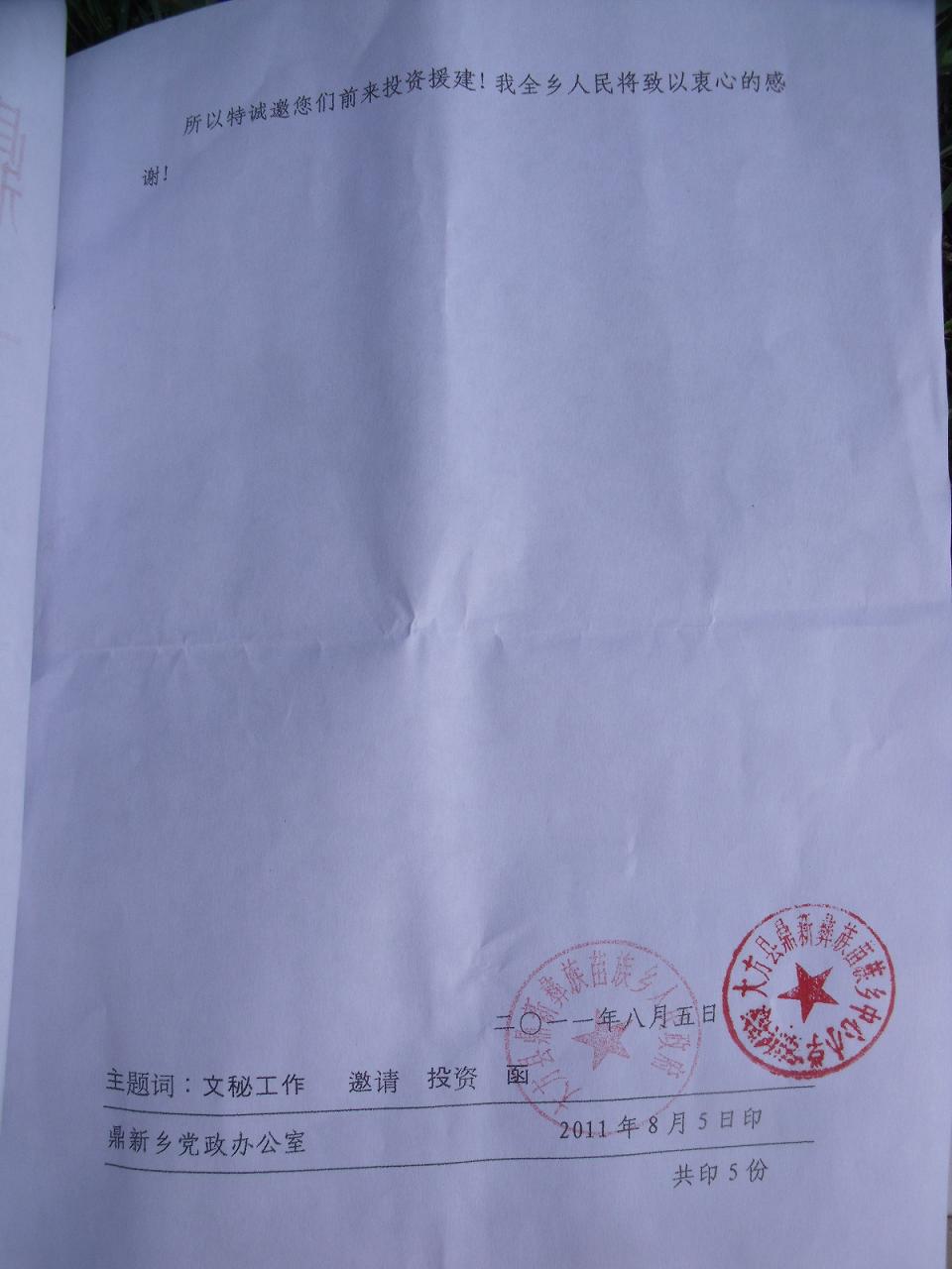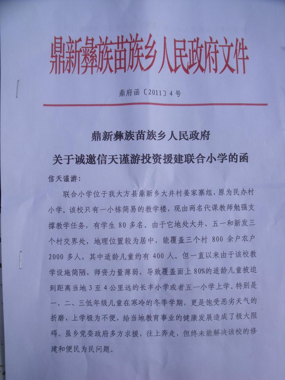 鼎新乡关于修建大井村联合小学的邀请函