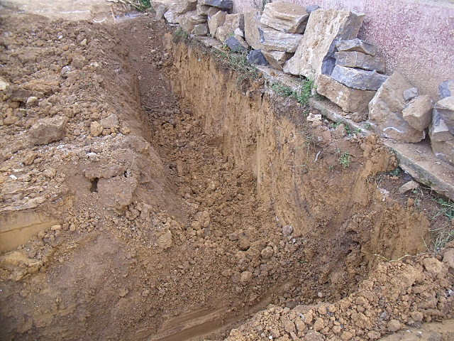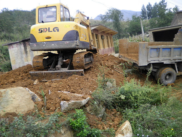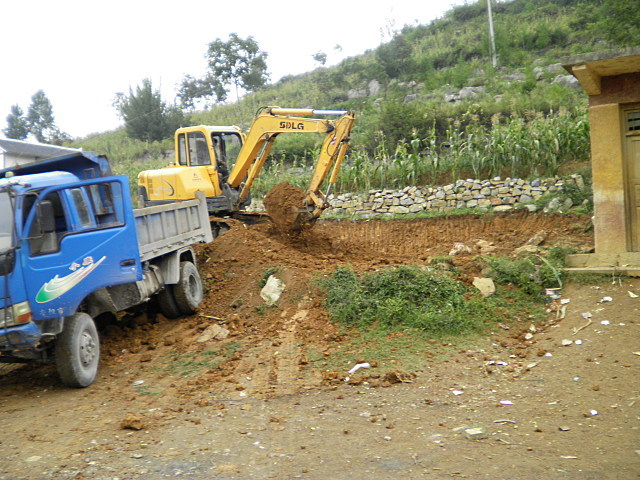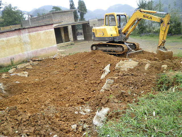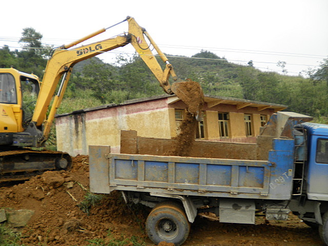 挖掘机开始挖掘平整新教室地基 背景即为将进行大修的旧教室
