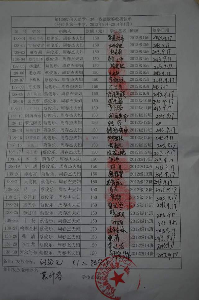 第138批马边第一初中(2013年3月-2013年7月)信天助学款发放签名表